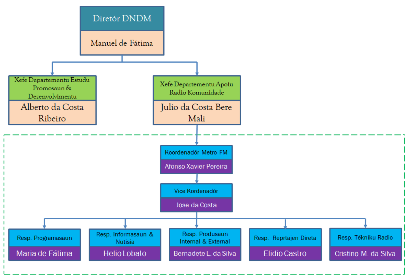 Atu realiza serbisu hanesan haktuir iha Diploma Ministerial ne’ebe temi iha leten, ekipa serbisu ba rádiu Metro FM distribui serbisu ho ninia responsavel sira hanesan organograma Metro FM nian tuir mai: