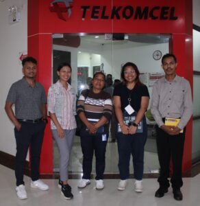 Xefe Departamentu Apoiu Rádiu Komunidade ho Jestora Radio Komunidade Bucoli hasai fotografia hamutuk ekipa Telkolmcel, iha edifísiu Telkomsel Timor Plaza, Díli, segunda feira (08/09/2025) ne’e.